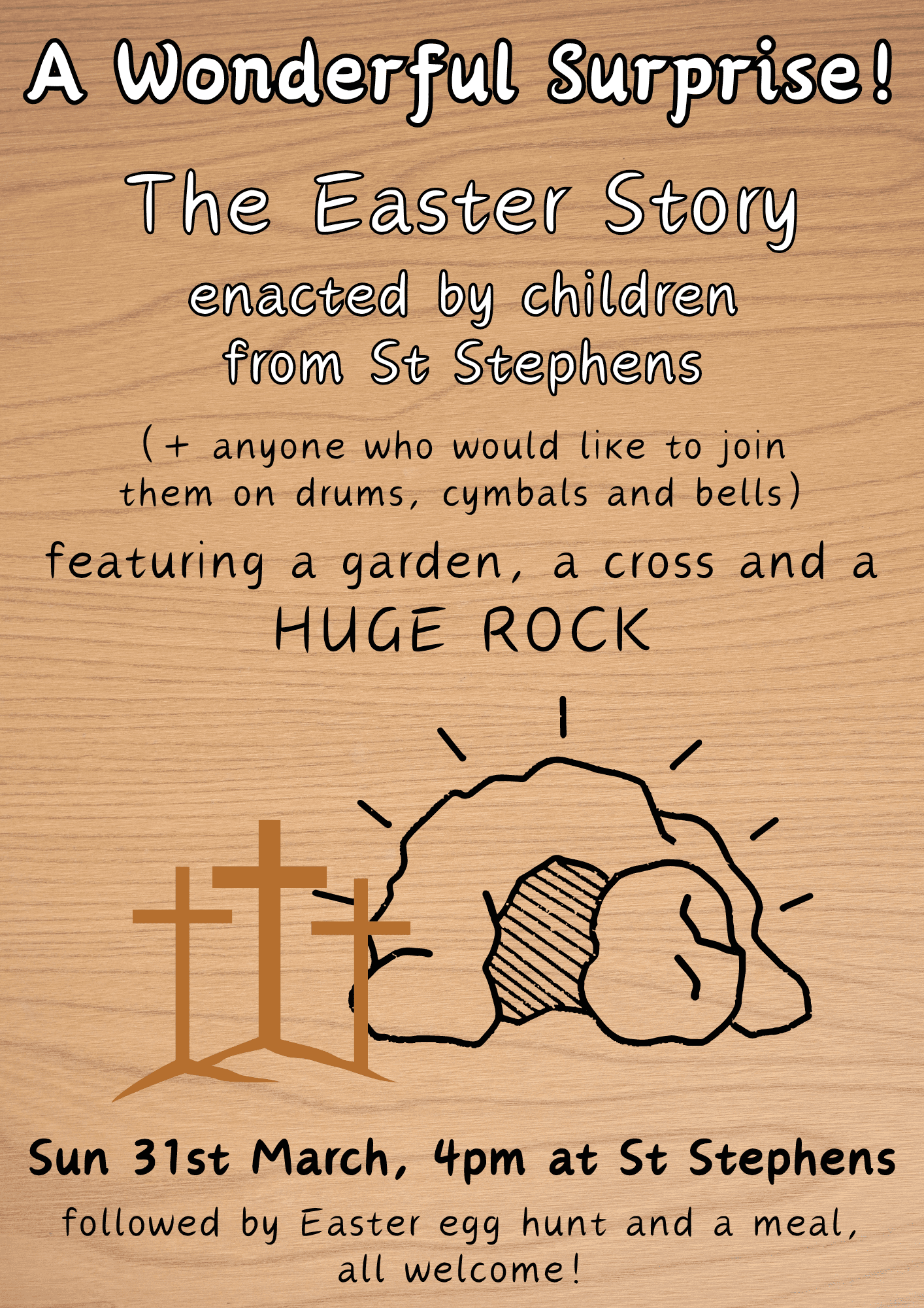 A Wonderful Surprise! The Easter Story enacted by children from St Stephens (+ anyone who would like to join them on drums, cymbals and bells) featuring a garden, a cross and a HUGE ROCK. Followed by Easter egg hunt and a meal, all welcome! Service starts at 4pm.