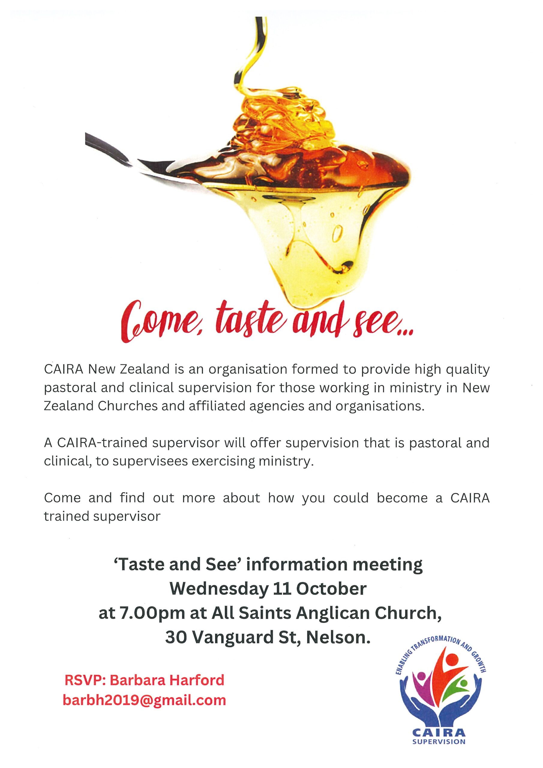 CAIRA NZ is an organization formed to provide high quality pastoral clinical supervision for those working in ministry in NZ churches and affiliated agencies and organizations. A CAIRA trained supervisor will offer supervision that is pastoral and clinical to supervisees exercising ministry.