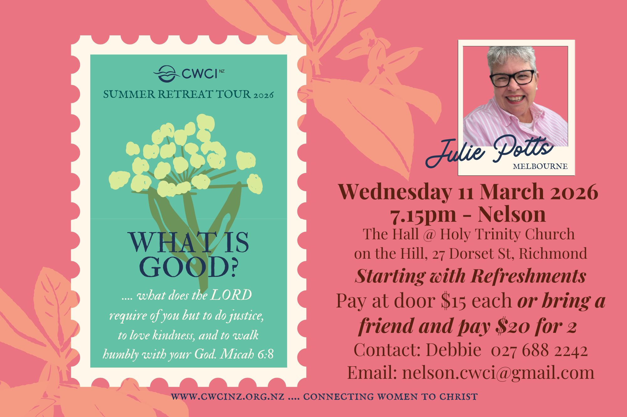 CWCI is a non-denominational Christian Women's organisation who aim to encourage Christian women of all ages and denominations, in their walk with God. For this event we have Julie Potts from Melbourne speaking on What is Good?... What does the Lord require of you but to do justice, to love kindness and to walk humbly…